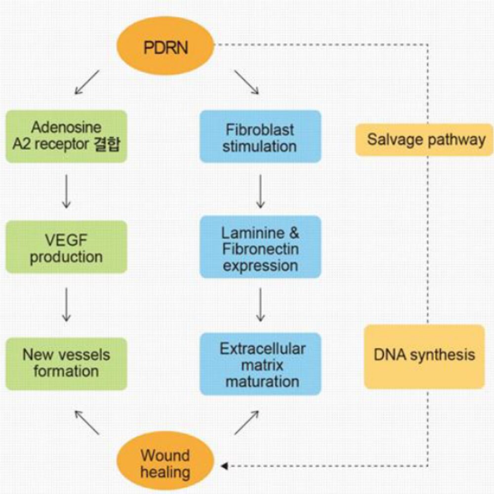 PDRN or polydeoxyribonucleotide have been proven to have significant effects on wound healing by promoting angiogenesis (formation of new blood vessels) and improving the blood circulation to the damaged ones. It also triggers fibroblast activity, which in turn increases the production of collagen and elastin to maintain the skin’s structure and firmness.